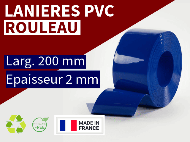 Disponible en rouleaux de 5 m, 10 m, 15 m, 25 m et 50 m, cette lanière PVC bleu opaque s’adapte à tous vos projets de rideaux PVC, de cloisonnements modulaires et d’aménagements industriels personnalisés.